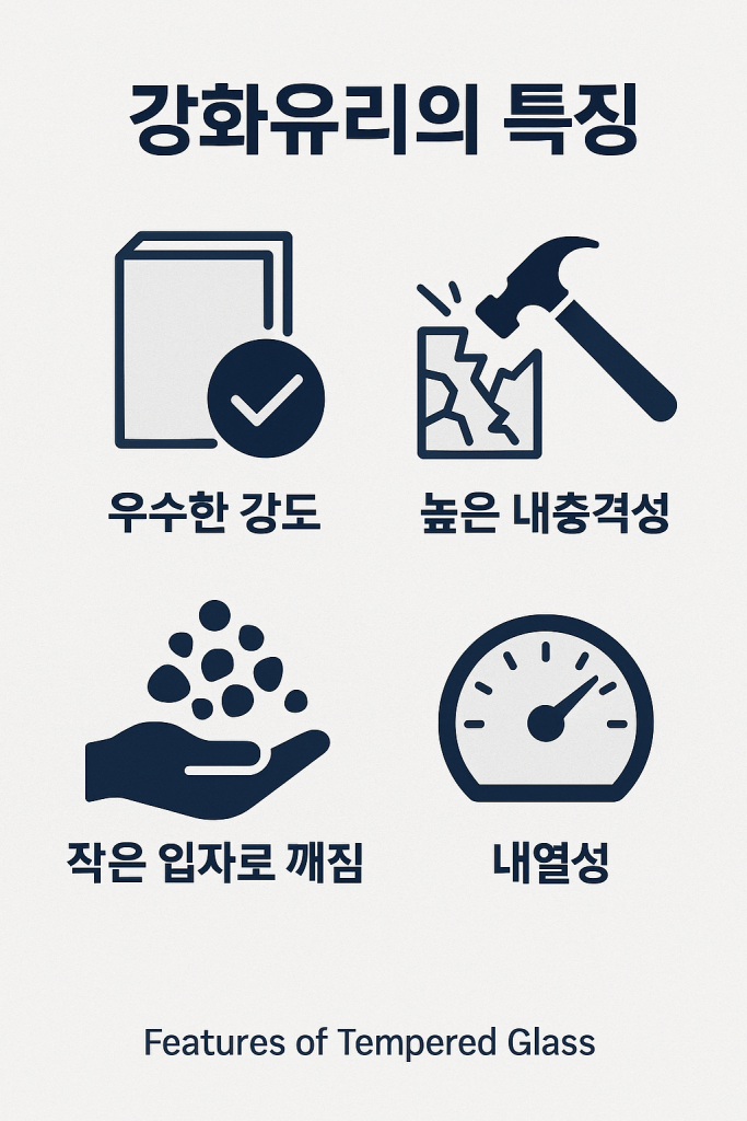 안전강화유리 Safety Tempered Glass 안전강화 유리는 일반 판유리를 고온에서 열처리하여 냉각 시킨것으로 표면에 생긴 압축 응력과 내부에 생긴 인장 응력으로 강도가 일반 유리보다 약 3배정도 강화된 유리입니다.파손시 입자가 날카롭지 않은 작은 조각으로 부서지는 특성때문에 사람에게 거의 상처를 입히지 않습니다.이러한 강화 유리의 특성상 사람들의 왕래가 빈번한 병원이나 학교, 열차, 주거 공간의 진열장, 유리 가구, 각종 도어, 산업용 내열유리 등 다양한 품목에 사용되고 있습니다.